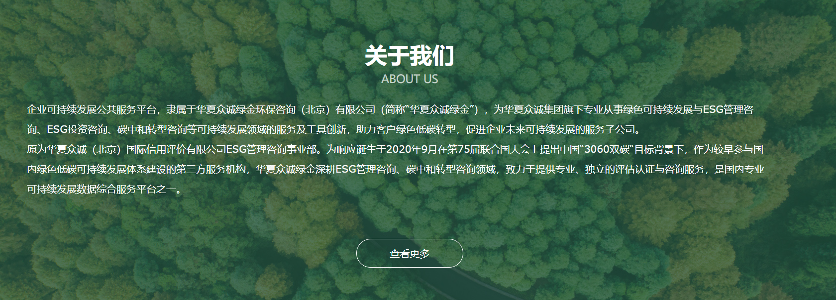 原為華夏眾誠(chéng)(北京)國(guó)際信用評(píng)價(jià)有限公司ESG管理咨詢(xún)事業(yè)部。為響應(yīng)誕生于2020年9月在第75屆聯(lián)合國(guó)大會(huì)上提出中國(guó)“3060雙碳“目標(biāo)背景下,作為較早參與國(guó)內(nèi)綠色低碳可持續(xù)發(fā)展體系建設(shè)的第三方服務(wù)機(jī)構(gòu),華夏眾誠(chéng)綠金深耕ESG管理咨詢(xún)、碳中和轉(zhuǎn)型咨詢(xún)領(lǐng)域,致力于提供專(zhuān)業(yè)、獨(dú)立的評(píng)估認(rèn)證與咨詢(xún)服務(wù),是國(guó)內(nèi)專(zhuān)業(yè)可持續(xù)發(fā)展數(shù)據(jù)綜合服務(wù)平臺(tái)之一。