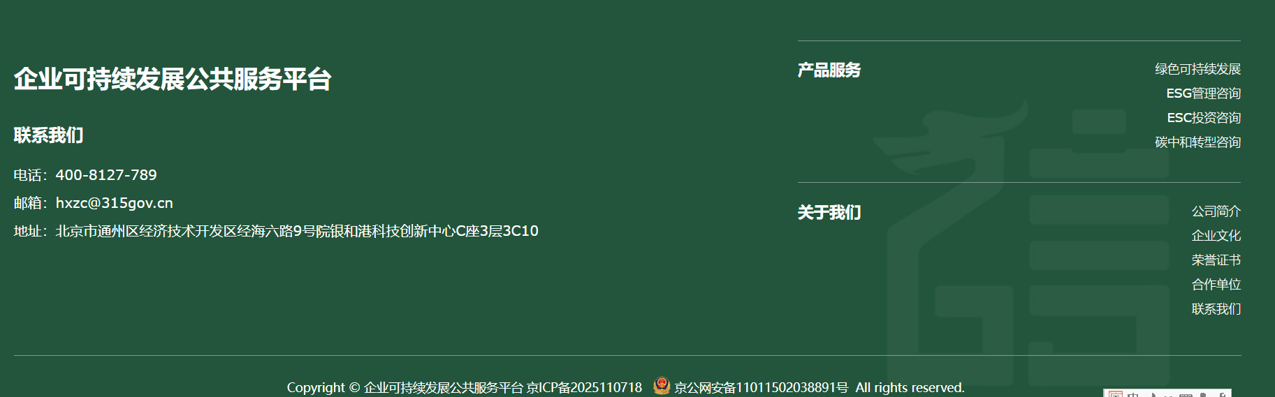 企業(yè)可持續(xù)發(fā)展公共服務(wù)平臺(tái),隸屬于華夏眾誠(chéng)綠金環(huán)保咨詢(xún)(北京)有限公司(簡(jiǎn)稱(chēng)“華夏眾誠(chéng)綠金”),為華夏眾誠(chéng)集團(tuán)旗下專(zhuān)業(yè)從事綠色可持續(xù)發(fā)展與ESG管理咨詢(xún)、ESG投資咨詢(xún)、碳中和轉(zhuǎn)型咨詢(xún)等可持續(xù)發(fā)展領(lǐng)域的服務(wù)及工具創(chuàng)新,助力客戶(hù)綠色低碳轉(zhuǎn)型,促進(jìn)企業(yè)未來(lái)可持續(xù)發(fā)展的服務(wù)子公司。